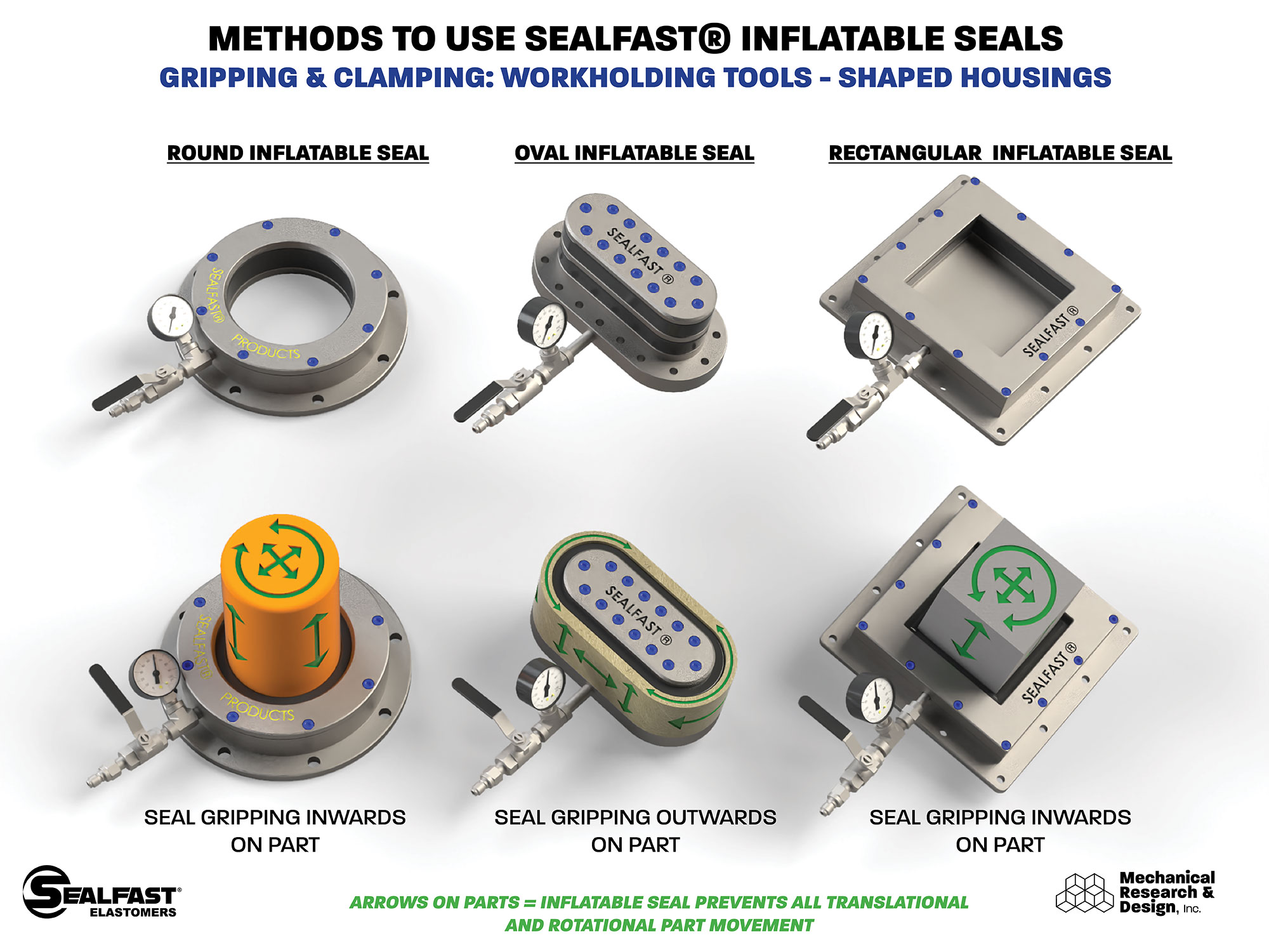 Inflatable seals can be vulcanized or formed in nearly any shape or size, from circular to rectangular, to nearly any irregular shape much more economically than common mechanical gripping systems. Since internal pressure can be regulated to high or low pressures, depending on the use-case application and seal profile, soft or fragile surfaces can be supported from movement, where more rigid mechanical systems cause damage. Several elastomers can be manufactured to be non-marking as well, leaving part-critical surface conditions intact after processing. Manufactured parts can also be clamped internally or externally with flexible inflatable seal work-holding systems.